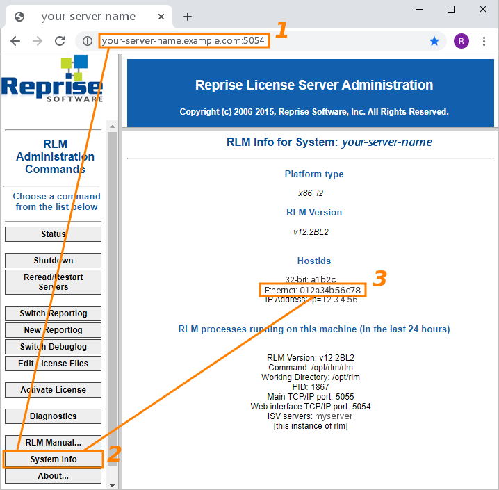 http://<your.license.server>:5054/Click on "System Info". Ethernet: xxxxxxxxxxxx displays the 12- or 8-digit RLM host ID.