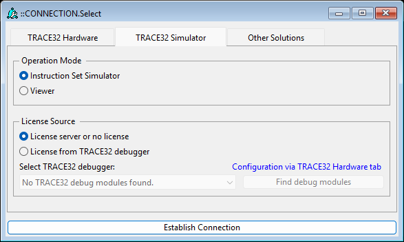 You can select between the TRACE32 Simulator or Viewer operation modes using the Connection Select Dialog: