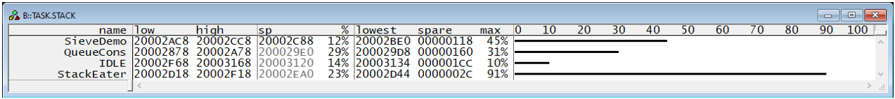 TRACE32 OS awareness provides the start and end addresses of each task’s stack (low
